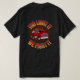 The bold back design features a classic red fire truck bursting through radiant lines in fire-inspired colors—deep red, flame orange, and golden yellow—with the phrase arched around it for maximum impact and easy readability.