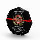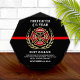 Personalized firefighter of the year award, featuring A thin red line on a solid black bacground, and the Maltese cross in the center.