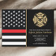 This design features a firemen's flag with black and white stripes, and a thin red line stripe as well. A fireman's badge sits above all of the party details for the retiring firefighter, lieutenant, or chief's retirement party. The invitations can also be customized for a firefighter academy graduate.