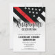This design features a firefighter flag with black and white stripes, and a thin red line stripe as well. "Retirement Celebration" sits above all of the party details for the retiring firefighter, lieutenant, or chief's retirement celebration.