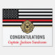 This design features a firemen's flag with black and white stripes, and a thin red line stripe as well. "Congratulations" and the fireman's badge text sits above the name of the graduating or retiring firefighter, lieutenant, or chief. Celebrate in style!