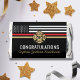 This design features a firemen's flag with black and white stripes, and a thin red line stripe as well. "Congratulations" and a fireman's badge sits above the name of the graduating or retiring firefighter, lieutenant, or chief. Celebrate in style!