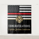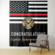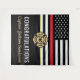 This design features a firemen's flag with black and white stripes, and a thin red line stripe as well. "Congratulations" and a fireman's badge sits above the name of the graduating or retiring firefighter, lieutenant, or chief. Celebrate in style!