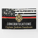 This design features a firemen's flag with black and white stripes, and a thin red line stripe as well. "Congratulations" and a fireman's badge sits above the name of the graduating or retiring firefighter, lieutenant, or chief. Celebrate in style!