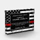 Celebrate and show your appreciation to an outstanding Firefighter with this Thin Red Line Award - American flag design in Firefighter Flag colors , distressed design. Personalize this firefighter retirement award with fireman name, text with fire department , fire station, name and community, and date of retirement. This thin red line award is perfect for firefighter retirement gifts, fireman anniversary awards and recognition of years of service. COPYRIGHT © 2020 Judy Burrows, Black Dog Art - All Rights Reserved. Firefighter Retirement Thin Red Line Anniversary Acrylic Award