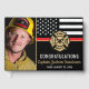 This design features a firemen's flag with black and white stripes, and a thin red line stripe as well. "Congratulations" and a fireman's badge sits above the name of the graduating or retiring firefighter, lieutenant, or chief. Celebrate in style! Customize even further with a photo of the retiring firefighter.