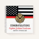 This design features a firemen's flag with black and white stripes, and a thin red line stripe as well. "Congratulations" and a fireman's badge sits above the name of the graduating or retiring firefighter, lieutenant, or chief. Celebrate in style!