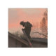 A piece of wood wall art featuring a photo of a firefighter climbing a ladder to a burning home with a sunset in the background.
