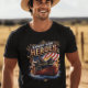 This custom t shirt features Four firefighters in a rowboat, battling flames and an American flag in the background. symbolizing bravery and heroism,