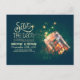 Special and unique save the date postcard with beautiful whimsical mason jar with glowing lights - fireflies - lightning bugs. Modern yet vintage save the date perfect for rustic country wedding themes.