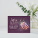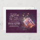 Special and purple save the date postcard with beautiful whimsical mason jar with glowing lights - fireflies - lightning bugs. Modern yet vintage save the date perfect for rustic country wedding themes.