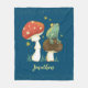 Cute fairy tale inspired illustration of a frog prince sitting on a mushroom and watching the fireflies. Whimsical woodland frog themed blanket is customizable and allows you to add your name!