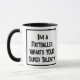 Funny slogan on a mug that says "I'm a Footballer. what's YOUR super talent?". Two Tone Mug for a Footballer. Black and white bold text.