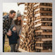 A high-quality graphic of a family of three admiring a large, neatly stacked pile of firewood. They are smiling and look proud of their accomplishment in a warm, cinematic photograph.