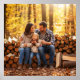 A high-quality graphic of a family of three taking a break from stacking firewood, drinking hot chocolate, with a warm autumn forest in the background.