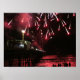 Red fireworks over the water at the pier at Hermosa Beach, CA.