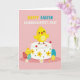 Designed with a soft pastel palette, the illustration centers on a fluffy yellow chick with wide, gentle eyes and an open smile, perched atop a two-tier cake as if posing proudly for someone it trusts. The cake is iced in creamy white with a scalloped frosting border, dotted with small red and coral round treats that read like berries. Yellow flower shapes and tiny green accents decorate the sides, giving the scene a spring garden feel 🌷. Around the base sit decorated eggs in muted tones—one striped yellow, one dotted teal, and one banded red—clustered close together like friends gathered for a sweet moment. The pink ground is sprinkled with tiny white daisies with yellow centers, adding a tender, affectionate atmosphere without needing any extra characters 🐰. Near the top, a short headline sits centered in bright contrasting colors, standing out clearly against the light background. The upper edge of the cake shows a neat frosting ridge with evenly spaced red and coral dots.