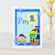 1st birthday card with funny pirate and ship, clown, penguin and balloons, on a blue background. Easily personalize this design by adding or changing the text.