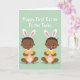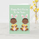 This design shows two animated infants with deep brown skin sitting side by side on a muted sage-green background, their bodies angled slightly inward as if sharing a quiet, affectionate moment 🐰. Both have detailed curly dark hair and large, glowing eyes, and each wears a daffodil-yellow romper trimmed with a white scalloped collar. On their heads are headbands with tall white ears and soft pink inner sections, adding a springtime touch 🐇. One infant has a tiny white flower tucked into their hair, a small detail that sets them apart while keeping the pair visually matched. A small pink bunny graphic with oversized ears sits on the chest of each romper, and their hands rest gently over it as though they’re protecting a shared secret. One baby shows a soft closed-mouth smile while the other smiles with a hint of little teeth, and their expressions feel like a sweet bond captured mid-glance. Across the top, centered above their heads, white lettering in a flowing cursive style spells out a first-occasion message against the green field. The overall palette stays pastel and lightly glowing, with the yellow outfits standing out most against the calm sage backdrop.