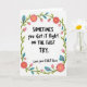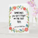 This card features a white background with a floral wreath framing a cheeky note that feels like a loving wink between family members ❤️. Centered inside the wreath, the message reads “SOMETIMES you Get iT Right ON THE FiRST TRY. Love, your FiRsT Born.” The lettering is casual and intentionally uneven, with mixed uppercase and lowercase that makes it feel like an affectionate, slightly teasing voice. The text sits in the middle of the open space and appears in dark ink for strong contrast against the white. Around it, an olive-green garland loops into a full circle, dotted with coral-pink flowers that have spiky petals and sunny yellow centers 🌼. Smaller soft-pink buds tuck between the greenery, adding a gentle, cozy rhythm like little pauses in a conversation. Teal leaves fan outward here and there, some touched with faint pink lines, and the wreath forms a neat ring around the words.