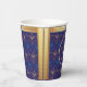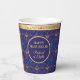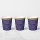 First Candle of Hanukkah. Happy Hanukkah Festival of lights party invitation beauty Jewish holiday card. Beautiful Jewish Holiday Chanukkah background with traditional Chanukah decorative symbols - wooden dreidels (spinning top), donuts, hanukkiah menorah, candles, star of David and glowing lights wallpaper gold hanukkiah navy blue pattern pattern. Hanukkah festival of lights event decoration. Jerusalem, Israel. Crafts & Party Supplies > Party Supplies > Tableware > Paper Cups Funny Design with with text template. Personalize them by adding name or wishes text. Two sides design. Customize