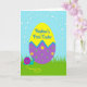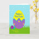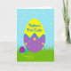 This design shows a spring scene centered on an oversized decorative egg that feels like it’s being admired the way close friends admire each other’s good news 🌷. The top half of the egg is bright yellow, and near the upper area there’s a handwritten-style message in a darker ink, placed to stand out against the light background. A zigzag border in medium blue runs across the egg’s middle, dividing it from the lower section. The bottom half is deep purple, dotted with green spots and small yellow flowers that give the surface a sweet, celebratory look. In the grassy foreground, a small teal snail with a magenta spiral shell rests as if pausing to watch the egg, adding a gentle, companionable touch 🐇. A thin golden trail curves behind it through tall green blades, leading the eye toward a pale blue sky. Above, faint white dashed arcs sweep across the sky like a soft glow, hovering over the egg’s rounded top.