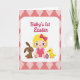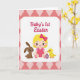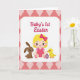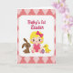 This card shows a cute, baby-like figure with bright yellow hair and a pink bow, drawn in a simple, flat illustration style with round eyes and rosy cheeks. Beside the figure stand two small companions—a chocolate-brown, long-eared bunny 🐰 and a sunny yellow chick—close enough to suggest a cozy, friendly little trio. Near the baby’s hand sits a striped egg, tucked in like a shared treasure that ties the scene to springtime. The characters are grouped inside a white frame with softly rounded corners, giving the picture a tidy, centered layout. Behind the frame, a rosy background is patterned with repeating pale-pink geometric shapes that add gentle depth without distracting from the faces. Across the top, bright red text in a flowing cursive style announces the occasion, standing out clearly against the lighter area above the illustration 🌷. The colors lean toward soft pinks, warm yellows, and earthy browns, and the striped egg shows alternating bands with a neat outline.
