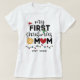 Show your joy for your very first Christmas as a mom with this lovely t-shirt decorated with a red Santa hat, green holly leaves, a golden ball, a red heart, and colorful Christmas lights.