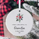 This simple yet stylish holiday ornament says "first Christmas as Grandpa" along with the baby name and year in modern text and script. An elegant red and white Christmas floral bouquet with poinsettias and green leaves decorates the white background. A gorgeous keepsake for any grandfather who first welcomed a grandchild this year!