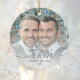 Commemorate the first Christmas of your marriage with this beautiful modern keepsake ornament. The charcoal gray text reads "Our first Christmas as Mr & Mr," with the words "Mr & Mr" in elegant handwriting script with flourishes before and after. Replace the sample image with your favorite photo, and add your last name and the year. A white gradient filter helps make the text pop.