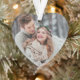 Heart shaped holiday keepsake ornament for a newlywed couples features a wedding photo on the front with "First Christmas as Mr and Mrs" wording and heart accent on the back. Personalize the modern custom monogram wording with first names and the wedding date. The red, soft black, and white colors on the back can be customized.