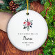This simple yet stylish holiday ornament says "first Christmas as Nana" along with the baby name and year in modern text and script. An elegant red and white Christmas floral bouquet with poinsettias and green leaves decorates the white background. A gorgeous keepsake for any grandmother who first welcomed a grandchild this year!