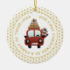 Our first Christmas as parents car with gifts gold glitter photo Ceramic Ornament. The front features a car with a deer and gifts and the text "Our First Christmas as a family of three" and a border of gold glitter snowflakes and the back the photo of the baby with the same border. Change photo and add your details!