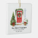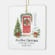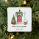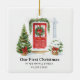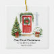 A serene white round ceramic ornament featuring a soft watercolor front door with wreath, potted evergreens, and warm lanterns. The arched headline reads “FIRST CHRISTMAS AT,” with lines below for your street, names, and year. The gentle sage-green palette suits any tree and makes a thoughtful first-home keepsake or housewarming gift. Update the address, add names, and set the year for a timeless piece you’ll hang every December.