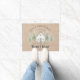Cozy neutral doormat with a burlap-look background, watercolor cottage and sage pines, and curved “First Christmas At” text. Customize the address, names, and year—perfect for new homeowners and holiday housewarmings.