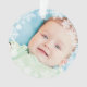 Elegant snowflake framed baby's first Christmas photo ornament design features a round border wreath of white winter snowflakes that frame the baby boy's newborn photo. A custom "Baby's First Christmas" message appears on the back with text the can be personalized with baby boy's name and birth year. The baby blue and slate gray color scheme can be changed to match your photo!