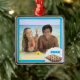 Tropical couple's first Christmas photo ornament for the tree. Aqua blue frame, decorated with a sand dollar and spotted junonia seashell. Simple and fun keepsake with small line of text for names or date.