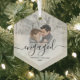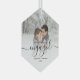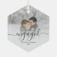 Commemorate your engagement with this beautiful modern keepsake ornament. The black text reads "Our first Christmas engaged," with the word "engaged" in elegant handwriting script with flourishes before and after. Replace the sample image with your favorite photo, and add your names and the year. A white gradient filter helps make the text pop.