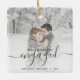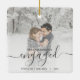 Commemorate your engagement with this beautiful modern keepsake ornament. The gray text reads "Our first Christmas engaged," with the word "engaged" in elegant handwriting script with flourishes before and after. Replace the sample image with your favorite photo, and add your names and the year. A white gradient filter helps make the text pop.