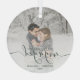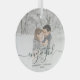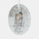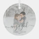 Commemorate your engagement with this beautiful modern keepsake ornament. The dark green text reads "Our first Christmas engaged," with the word "engaged" in elegant handwriting script with flourishes before and after. Replace the sample image with your favorite photo, and add your names and the year. A white gradient filter helps make the text pop.