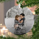 Commemorate your engagement with this beautiful modern keepsake ornament. The white text reads "Our first Christmas engaged," with the word "engaged" in elegant handwriting script with flourishes before and after. Replace the sample image with your favorite photo, and add your names and the year. A dark gradient filter helps make the text pop.
