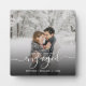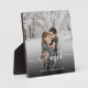 Commemorate your engagement with this beautiful modern keepsake plaque. The white text reads "Our first Christmas engaged," with the word "engaged" in elegant handwriting script with flourishes before and after. Replace the sample image with your favorite photo, and add your names and the year. A black gradient filter helps make the text pop.