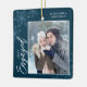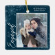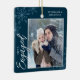 This dark blue square Christmas ornament is a perfect gift for the newly engage couple. The design features a photo frame with handwritten text "Engaged" and is accented with light blue snowflakes on a dark blue background. Personalize with a pictures of the couple, their names and year.