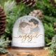 Commemorate your engagement with this beautiful modern keepsake snow globe. The text reads "Our first Christmas engaged," with the word "engaged" in elegant gold faux foil handwriting script with flourishes before and after. Replace the sample image with your favorite photo, and add your names and the year in gold-colored sans serif font. A white gradient filter helps make the text pop.
