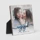 Commemorate your engagement with this beautiful modern keepsake plaque. The blue text reads "Our first Christmas engaged," with the word "engaged" in elegant faux foil handwriting script with flourishes before and after. Replace the sample image with your favorite photo, and add your names and the year. A white gradient filter helps make the text pop.