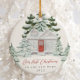 This beautiful holiday ornament features a festive painted home ready for Christmas with snow covered roof and winter pine trees. "Our first Christmas in our new home" typography with pretty red script is included on the front, with the personalized year and your new street address on a white background. The back of the seasonal ornament is the full address and the new home owner's name.