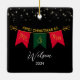 Celebrate your Mr. and Mrs. First Christmas with this elegant Couples First Christmas Ornament. Set on a sleek black background adorned with silver stars, this ornament features the words "Mr. and Mrs." in luxurious gold script, accented by classic red and green Christmas colors. Personalize it with the couple's names for the perfect newlywed gift that captures the magic of their first holiday season together. Ideal for creating a lasting keepsake that will be cherished for years to come