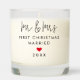 Personalized Christmas scented candle for the newlyweds with the text "Mr. & Mrs.", "first Christmas married", and the year with a red heart.
