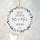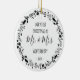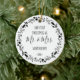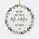 This design features a black and white wreath of Christmas ornaments, holly berries and foliage, surrounding the words "Our First Christmas as Mr. & Mrs." in whimsical black printing and handwriting fonts. Customize the front with your last name and the year, and the reverse side with your favorite square photo. (A light background works best with the black and white wreath frame, or remove the frame if you prefer).