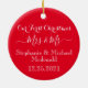A classic red and green ceramic Christmas ornament personalized with "First Christmas" and "Mr & Mrs."